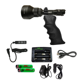 The most jaw dropping long range spotlight package you will find anywhere! The HD4X was designed to put the capability of 4 extremely functional and deadly flashlights into one incredibly durable design. Swap from green, red, white or IR-850 with the twist of dial. A 1/4 turn of the head creates an extreme zoom that illuminates up to 1,000 yards away. A new multi-function tail cap brightens and dims the light without impacting the full capability of your light. USB-C style wired dimmer control with USB-C charging cable makes your light more versatile and convenient to recharge. The HD4X operates one 18650 or high capacity 21700 size batteries providing the capability to spotlight game all night long! This package also includes our extremely popular ergo grip with flip-top ring mount making it easy to install your light or quickly remove it. You won't believe how much you are going to love this light!